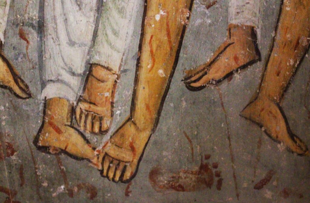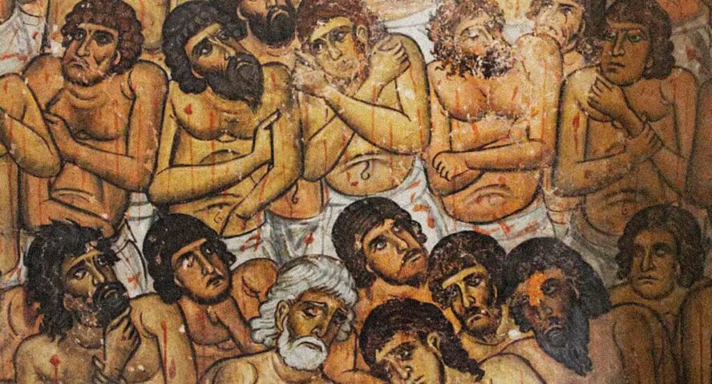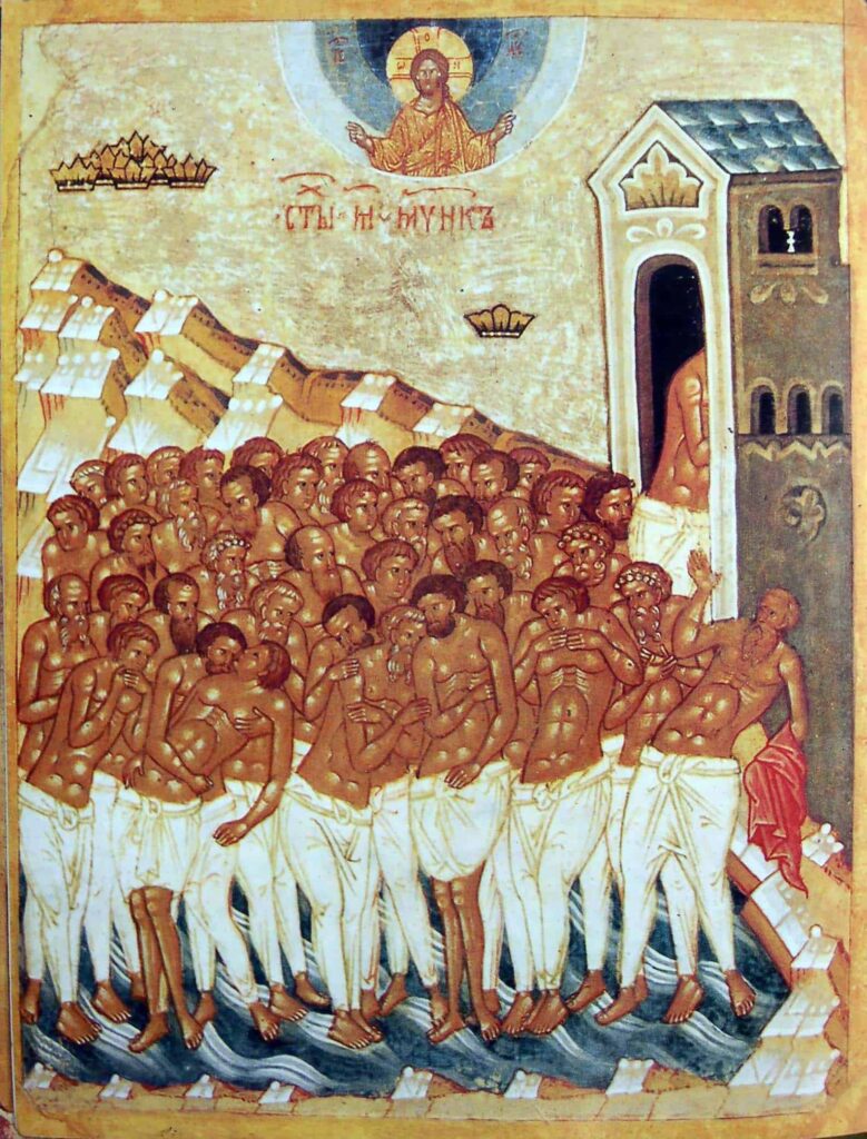 И вот, когда наступил морозный зимний день, мучеников привели к местному озеру и оставили там под стражей обнаженными, прямо на льду, где плескалась холодная вода. Рядом растопили баню, чтобы в смертной агонии воины отреклись от Христа и променяли Его на тепло… Но лишь один из страдальцев не выдержал и побежал к бане — и тут же упал перед ней замертво.